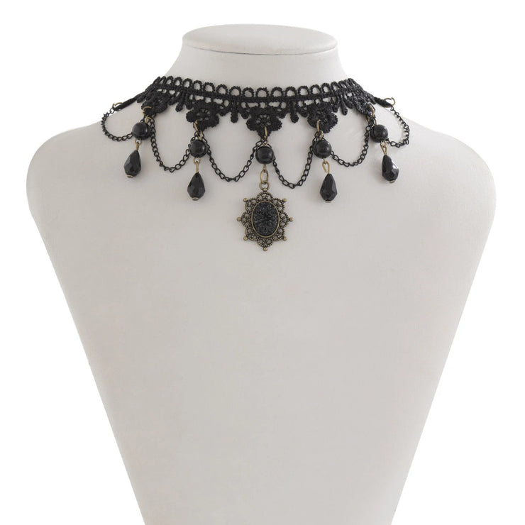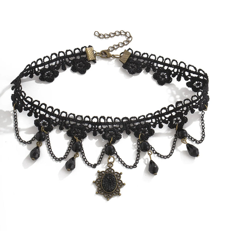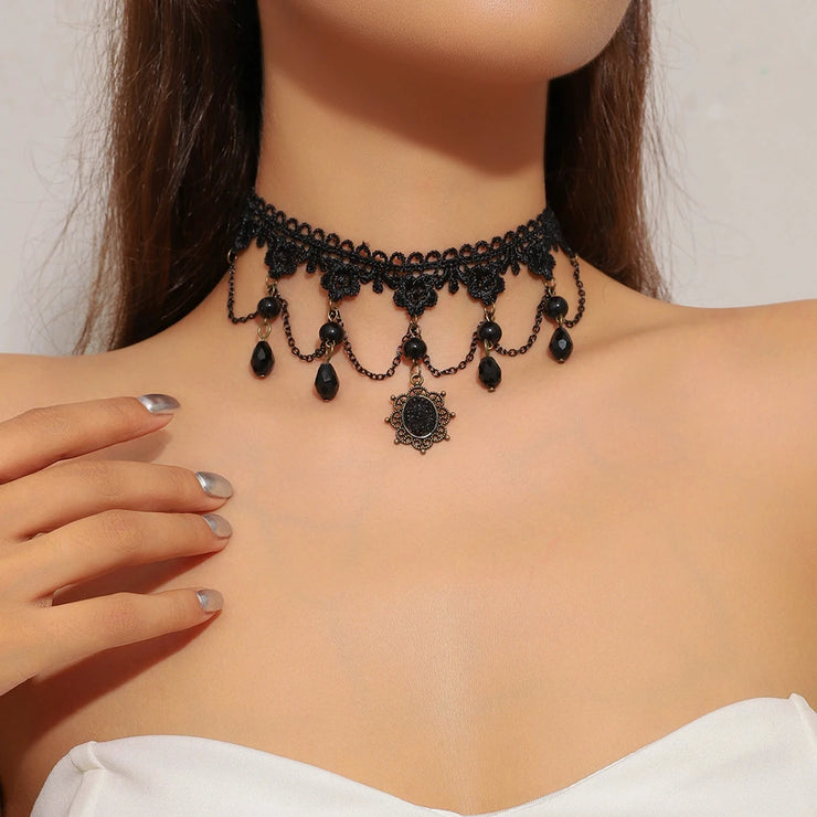 Gothic Punk Sexy Lace Black Crystal Pendent Necklace for Women Teens Girls Beads Flower Collar Necklace Rock Jewelry Gifts Party
