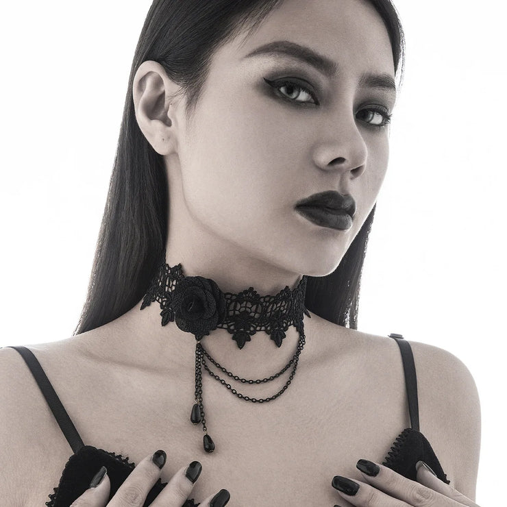Gothic Retro Court Oval-shaped Hollowed-out Lacework Pendant Black Water Drop Bead Tassel Flower Lace Necklace for Women Jewelry