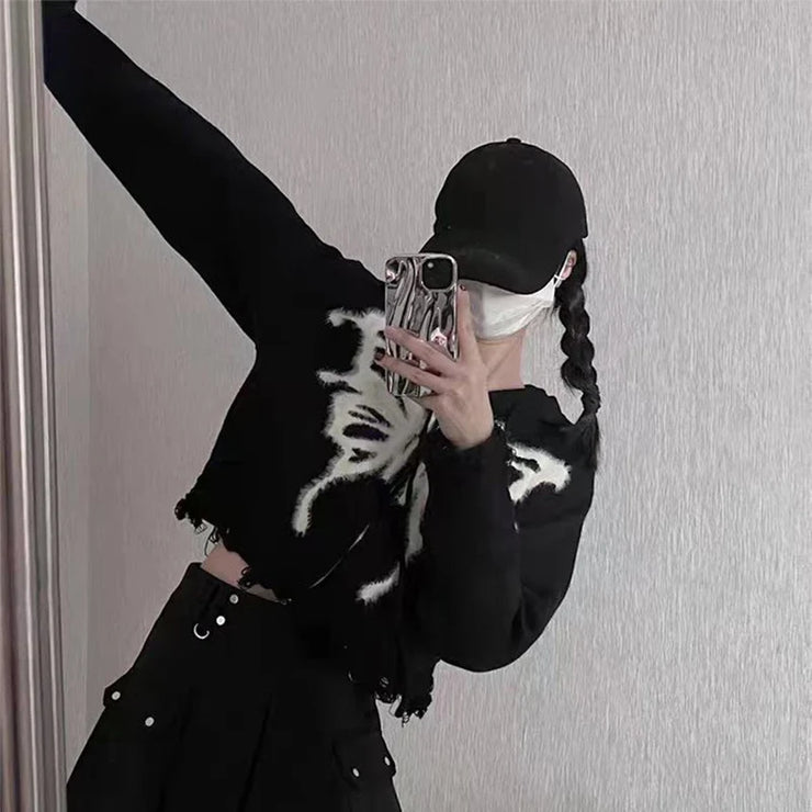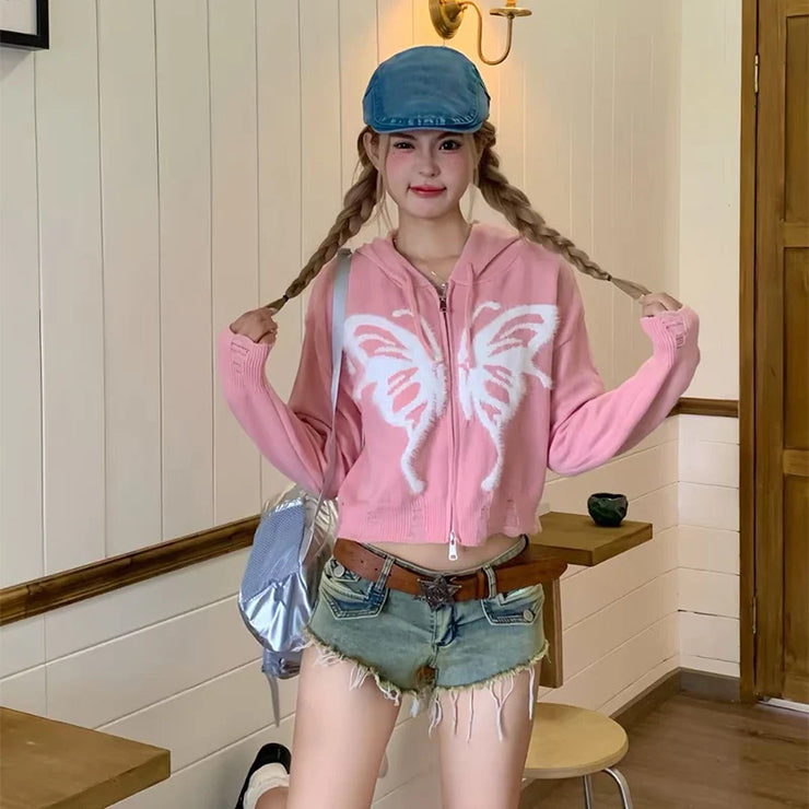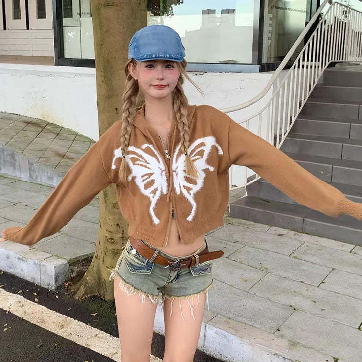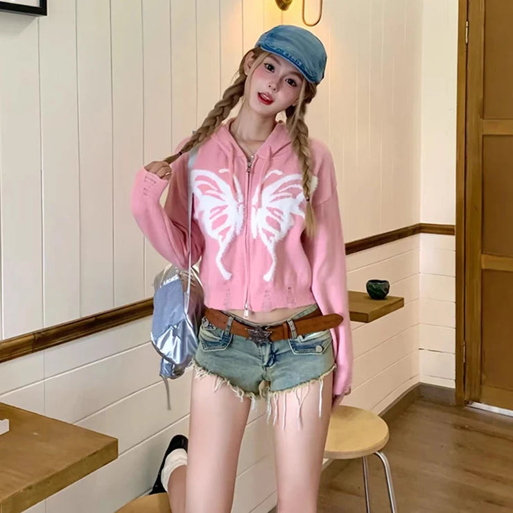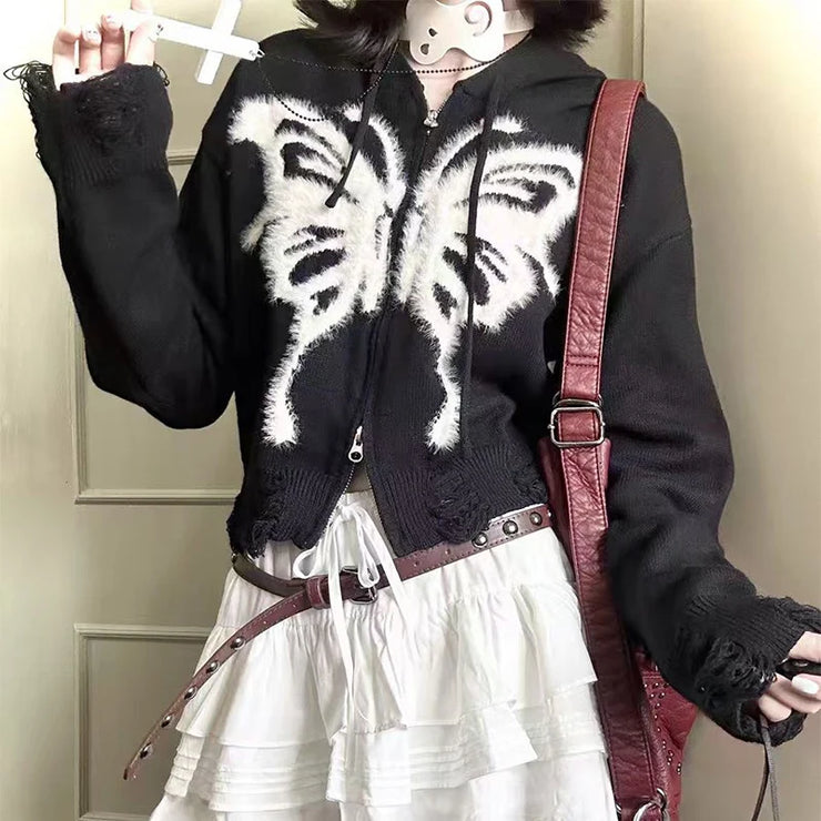 Gothic Style Butterfly Hooded Jacket Women American Spicy Girl Short Zip Up Cardigan Coat Autumn Y2K Retro Knitted Outerwear