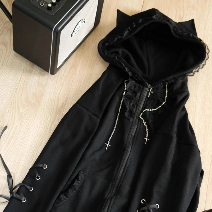Gothic Subculture Black Lace Loose Hoodie Women's Autumn Aesthetic Lovely Long Sleeve Hooded Coat Casual Warm Winter Overcoat