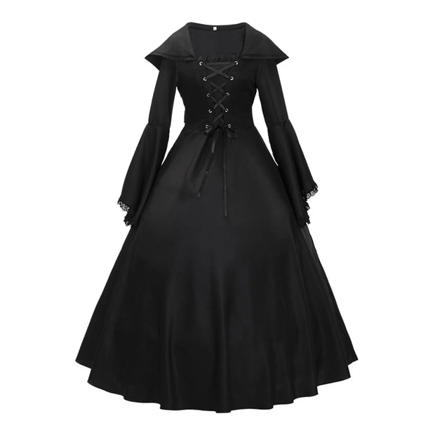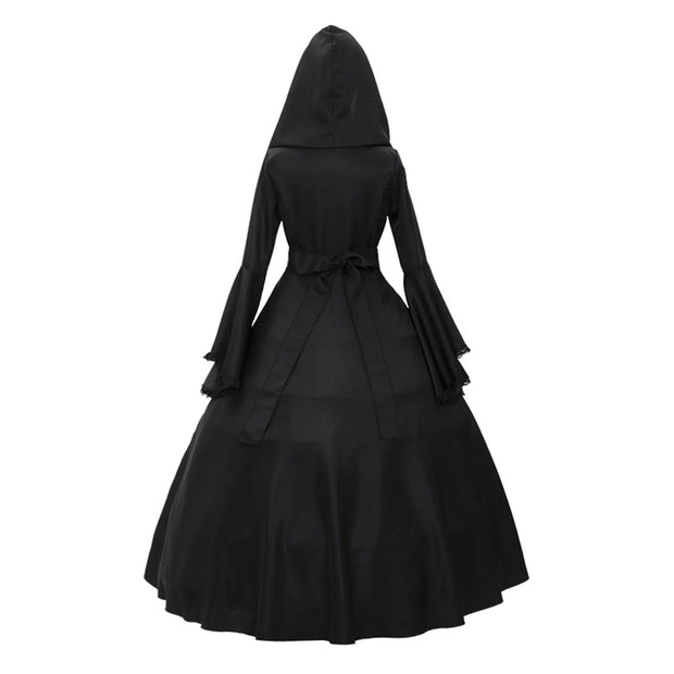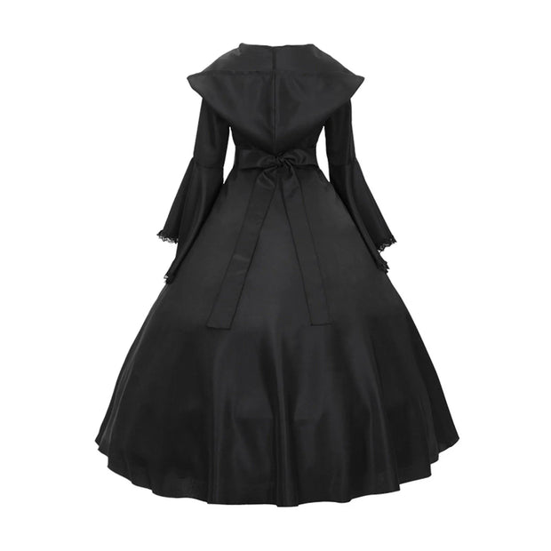 Gothic Medieval Dresses Retro Fashion Big Swing Long Sleeve Lace Up Hooded Dress Lace Flare Sleeve Dress Halloween Costumes