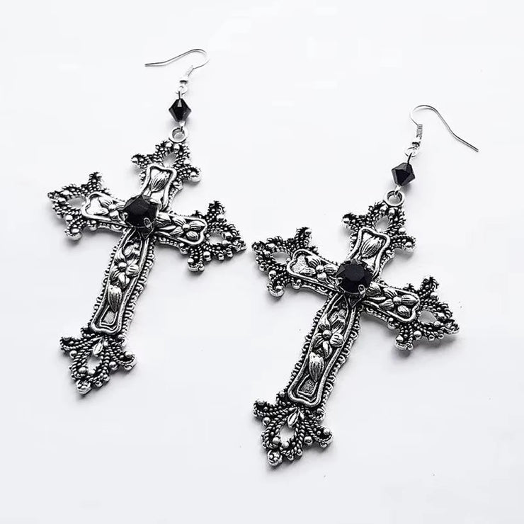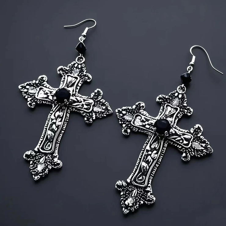 Goth Large Detailed Cross Black Drill Jewel Earrings Silver Color Gothic Punk Jewellery Fashion Gorgeous Statement Women Gift