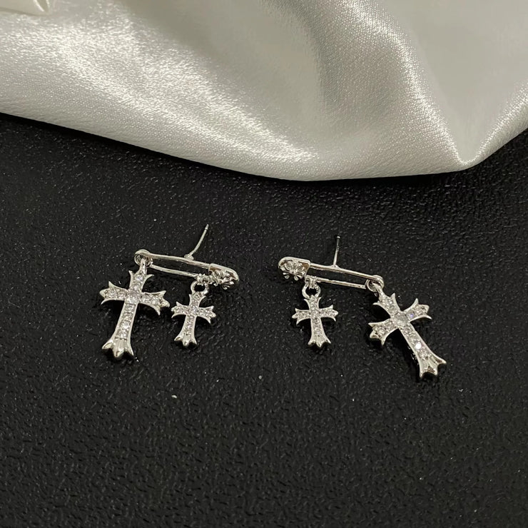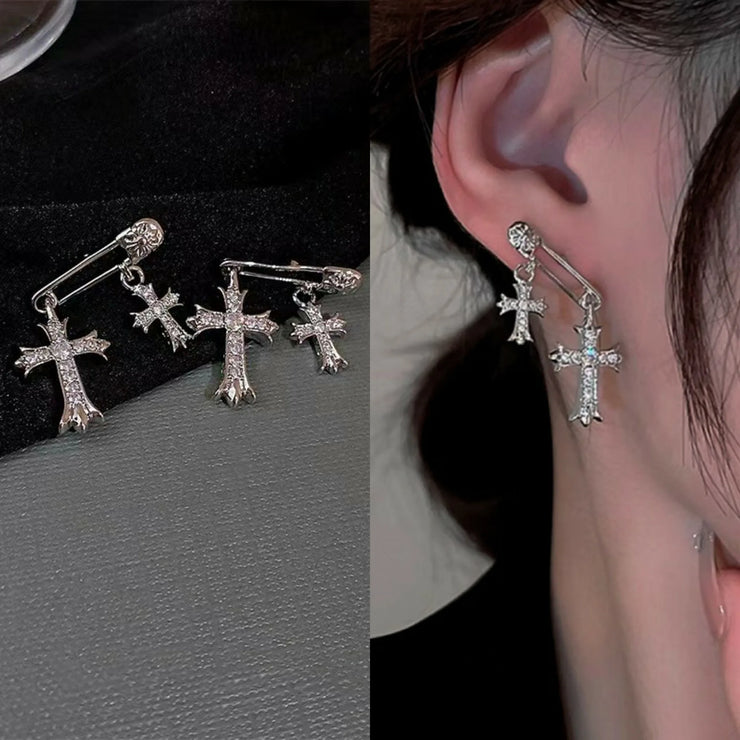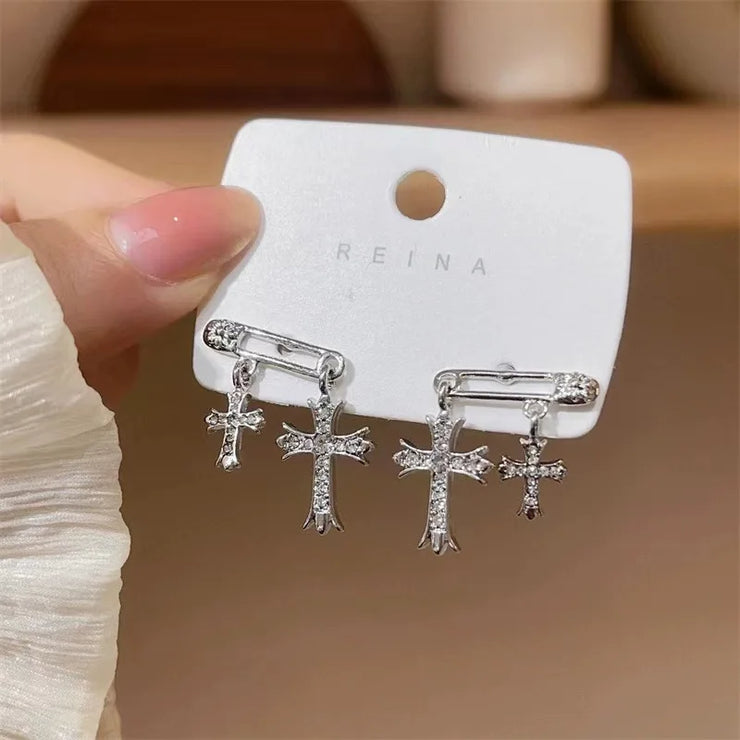 Goth Style Inlaid Rhinestone Clip Pendent Cross Stud Earrings For Lady Personality Versatile Daily Temperament Earrings Jewelry