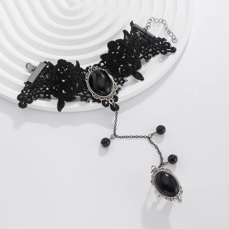 Sexy Gothic Oval Black Imitation Gemstone Round Bead Tassels Lace Bracelet Connected Ring for Women Creative Personality Jewelry