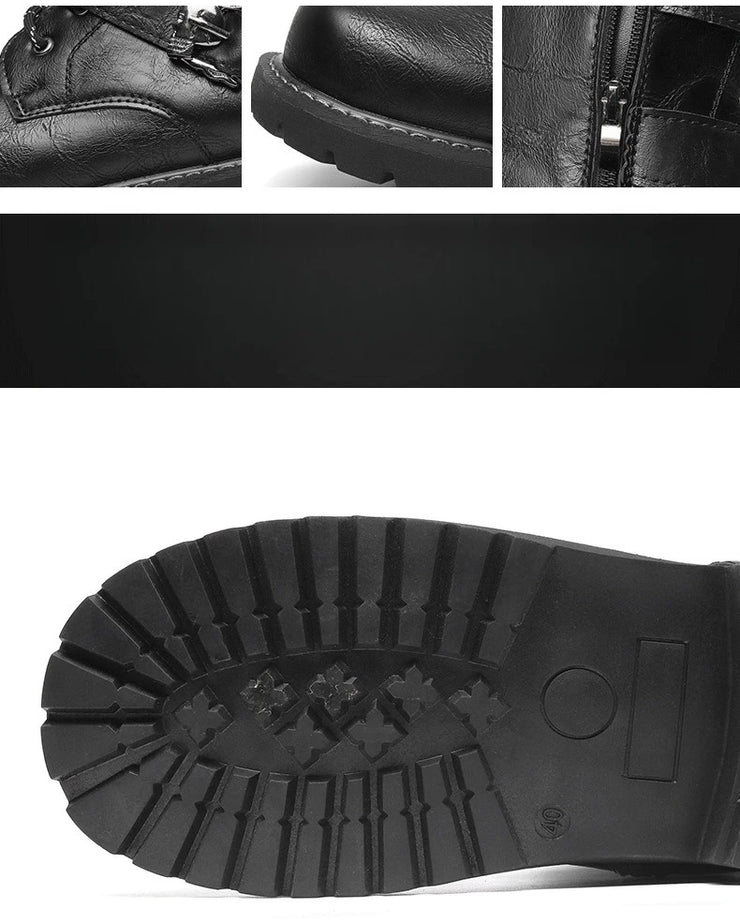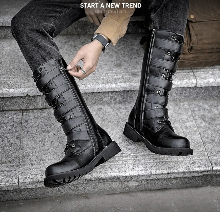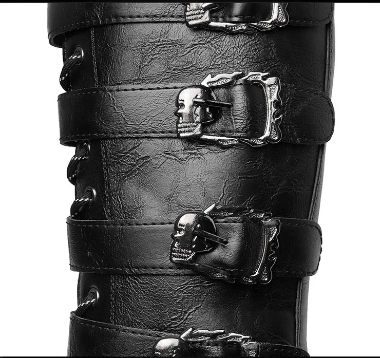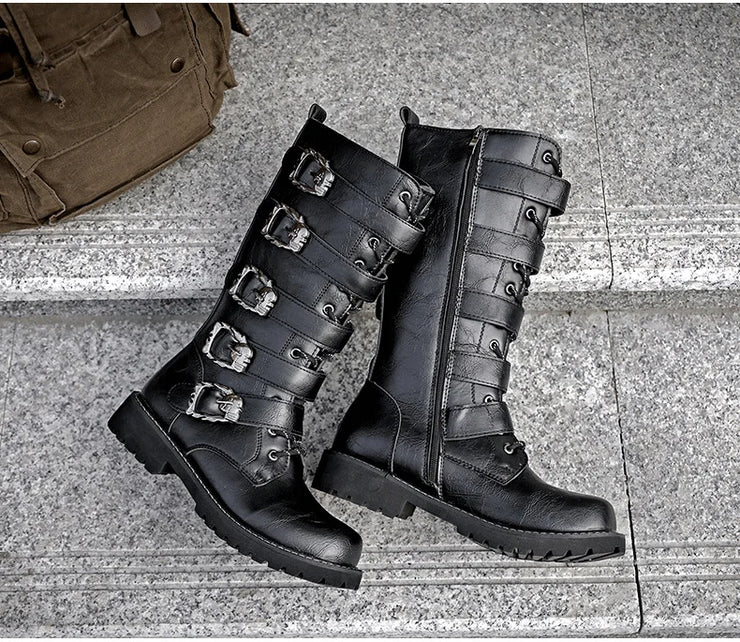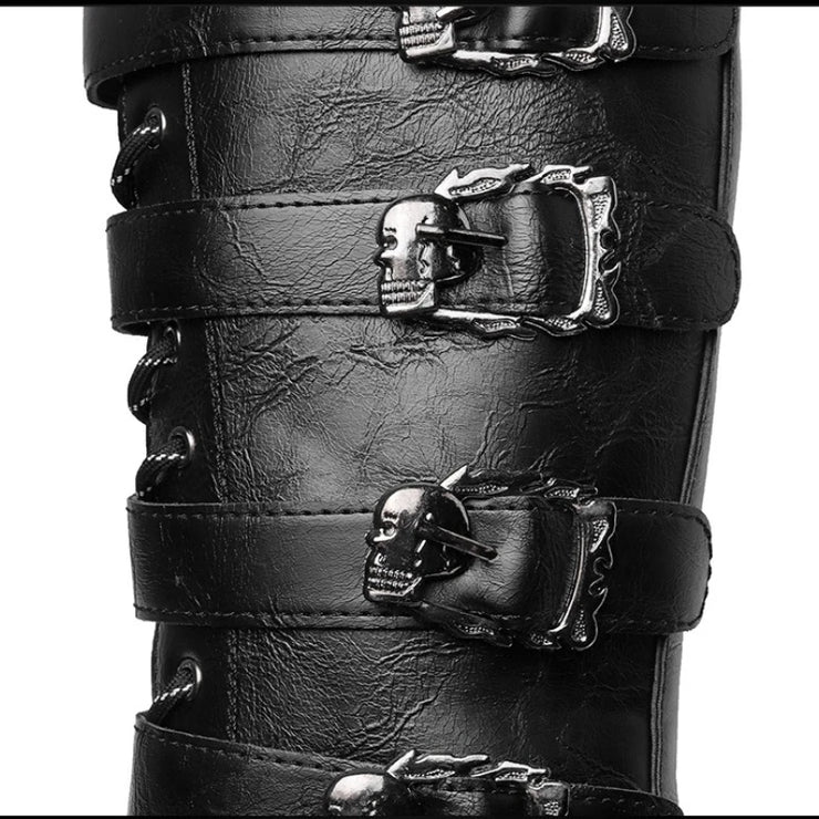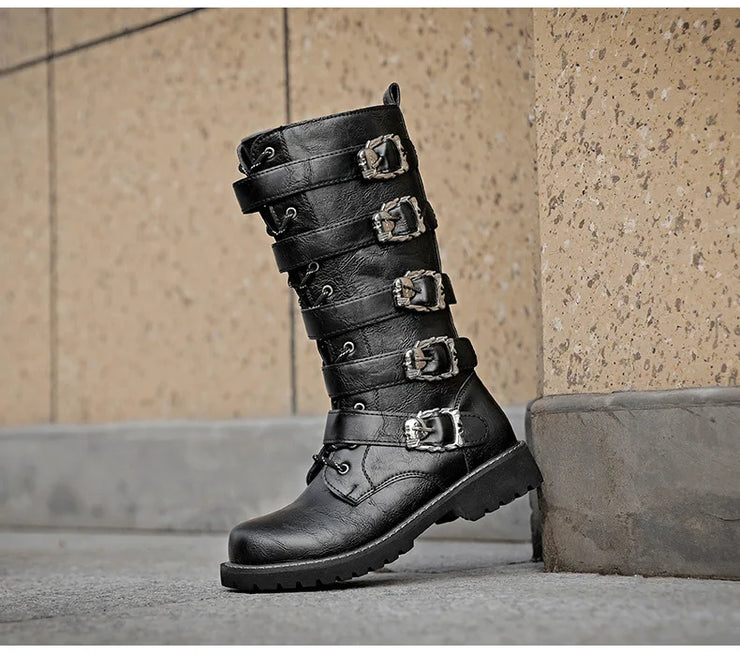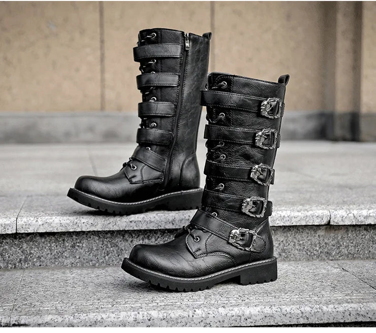 Men's Punk Gothic Biker Boots Tall Harness Buckle Side Zipper Riding Boots for Cosplay Costume Performance Comfortable Black