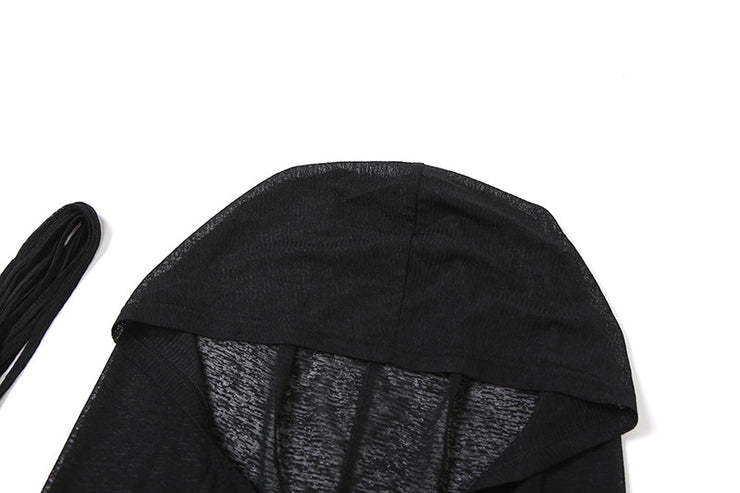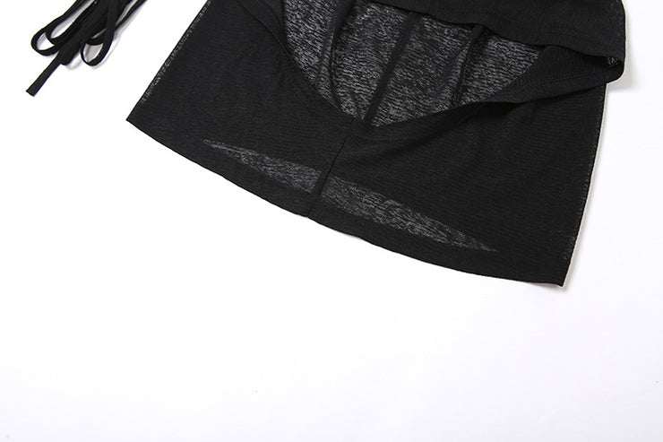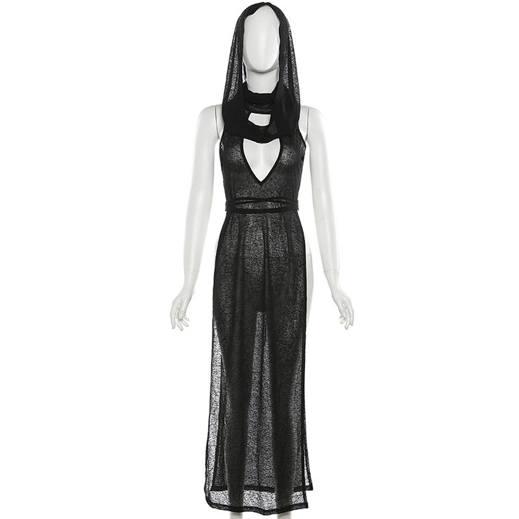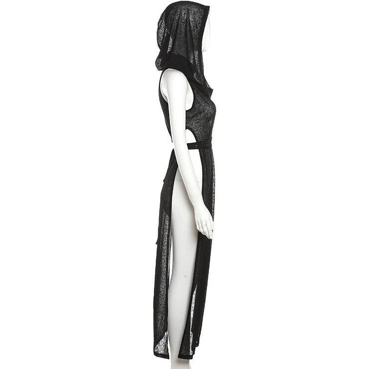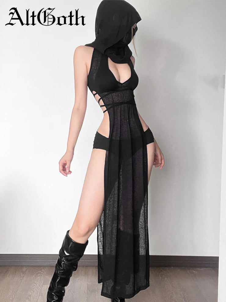 AltGoth Coquette Dark Gothic Sexy Dress Women Vintage Y2k Cyberpunk See Through Cut Out Split High Waist Knitted Hooded Dress