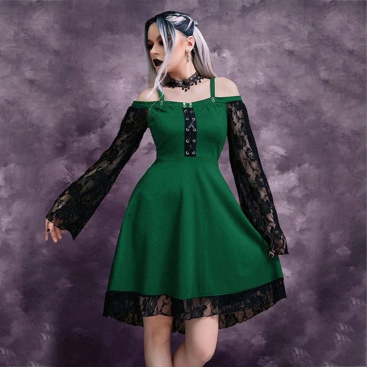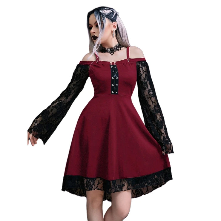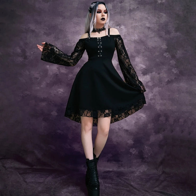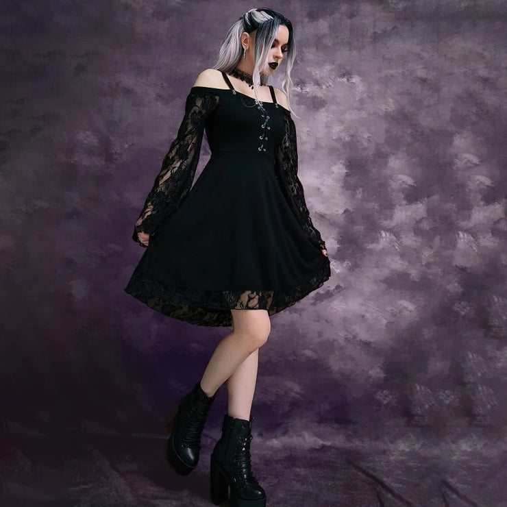 Gothic Punk Girls Midi Dress Sexy Lace Patchwork Long Flare Sleeve Dress Women Harajuku Cold Shoulder Strappy Halloween Sundress