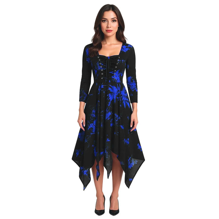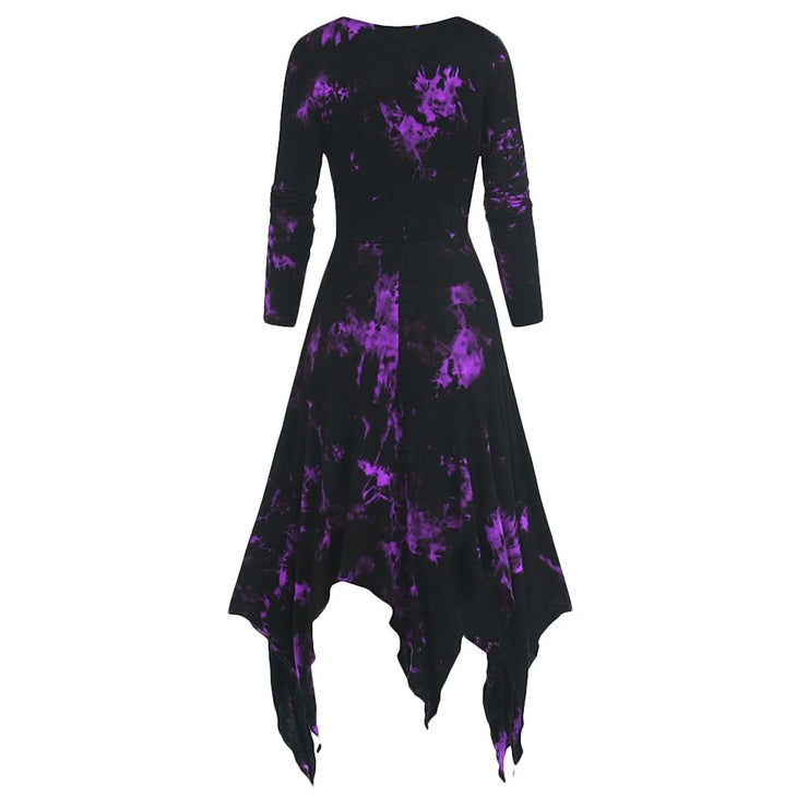 Gothic Tie-dye Dress Lace Up Long Sleeve Drree For Women Polyester Fabric Irregular Hem Performance Dress Halloween Costumes