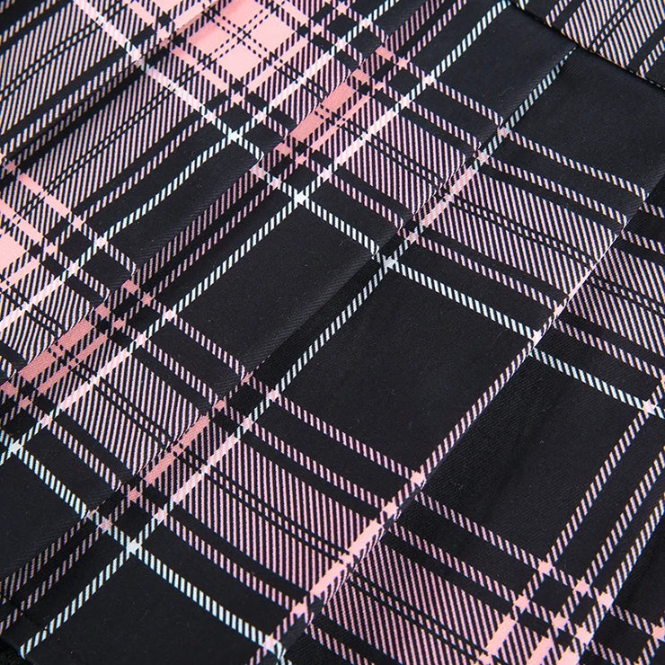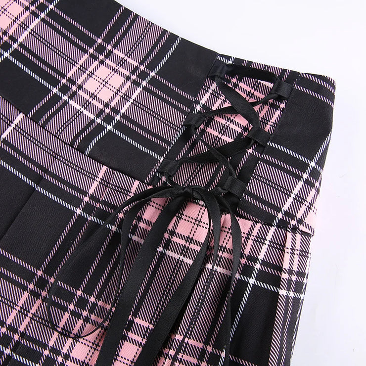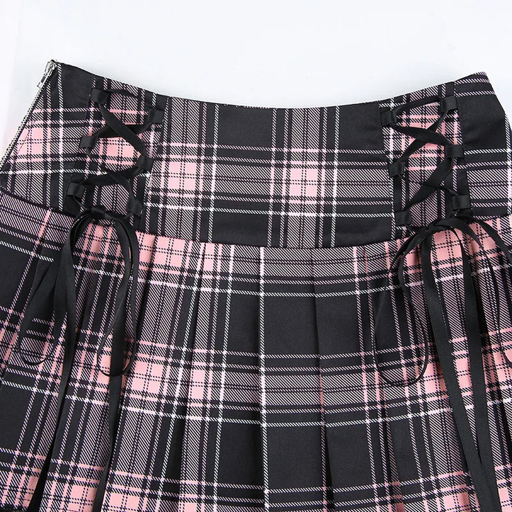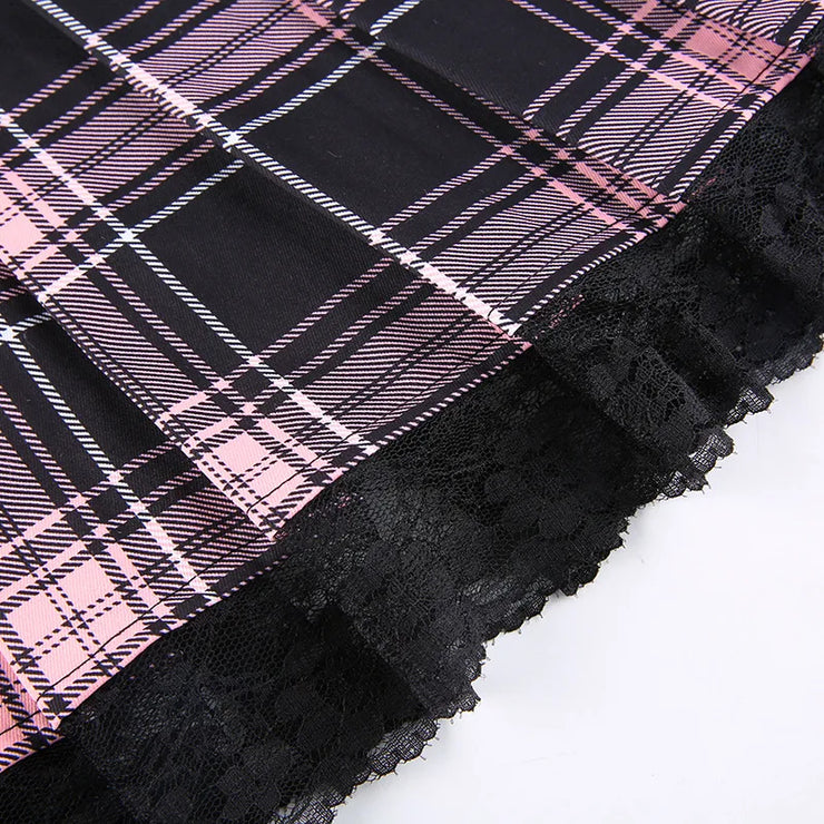 Goth Skirts Summer Y2K Woman Skirts Pink Stripe Plaid Lace Trim Pleated School Plaid Skirt Ladies Aesthetic Tie Up Jupe Femme
