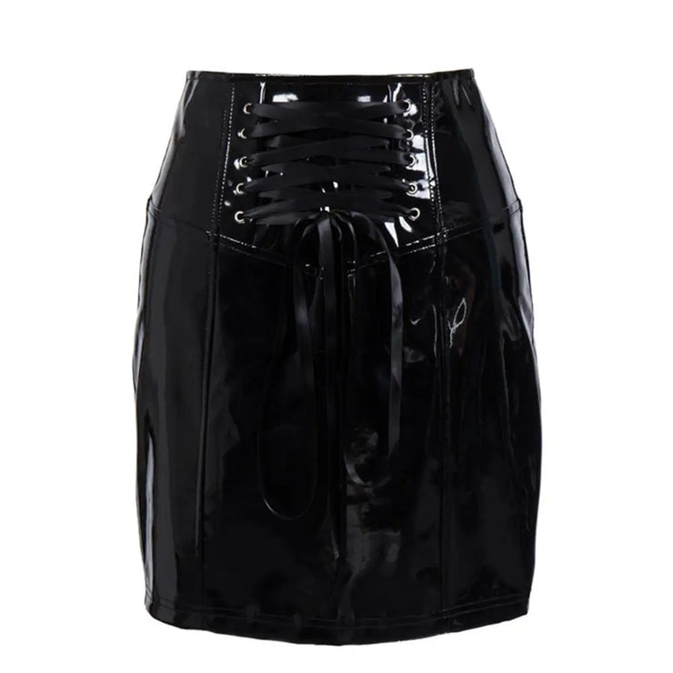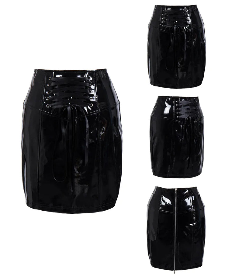Gothic Black Skirts for Women Latex PVC Leather Pencil Mini Skirt Lace Up Zip Shiny Bodycon Skirts Sexy Club Y2k Clothes