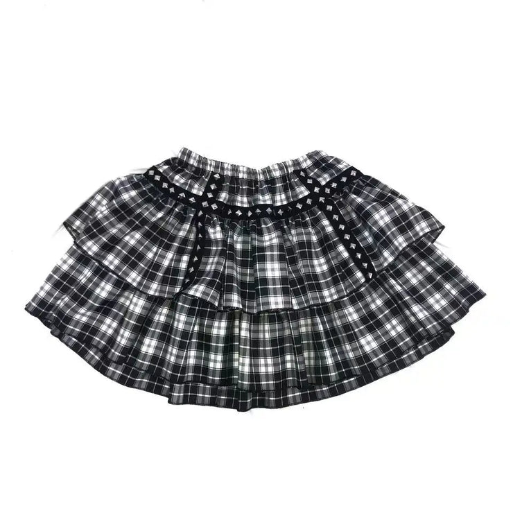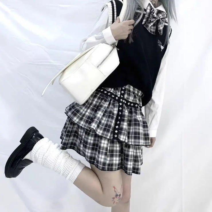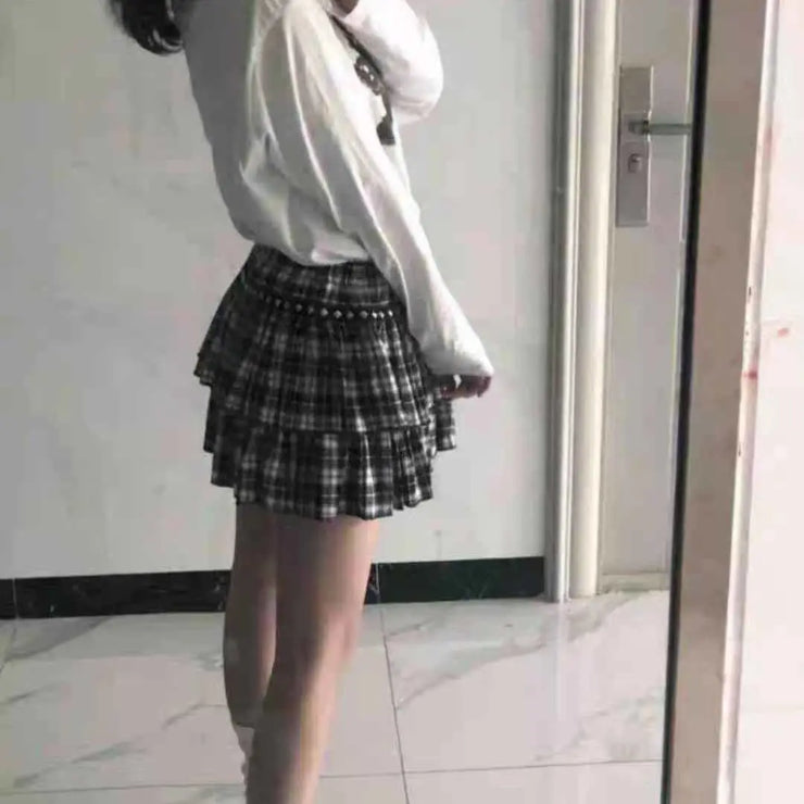 Gothic Women Y2K 2000s Skirt White Black Plaid Short Skirts Rivet Punk Style Double Layer High Waist Ball Gown Mini Skirt Female