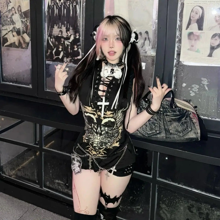 Gothic T Shirts 90s Women's Punk Vintage Clothes Y2k Kpop Streetwear Skulls Bandage Casual Tops Femme Emo Gyaru Grunge T Shirt