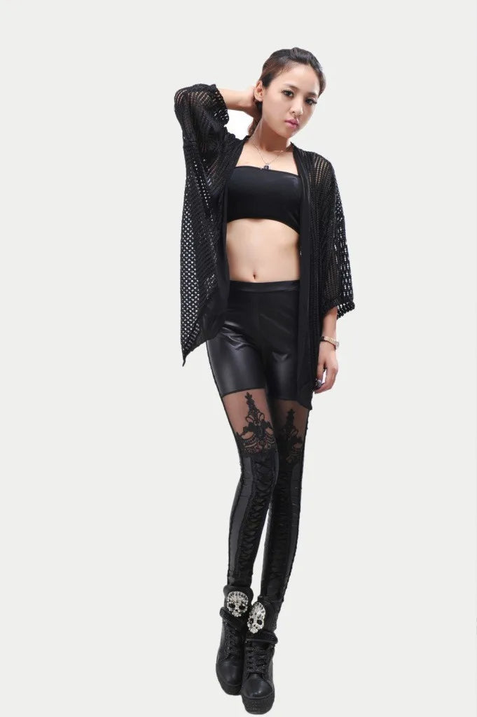 Black Punk Leggins Women Leggings Faux Leather Leginsi Lacina Calca Patterned Floral Bandage Lace Stitching Gothic Clothes PU