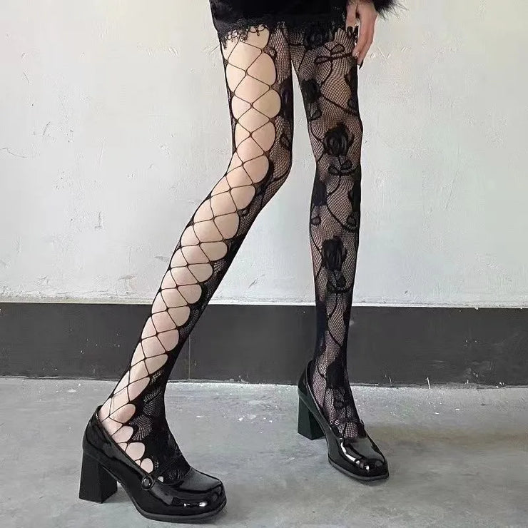 Gothic Hollow Out Rose Fishnet Stockings JK Lolita Mesh Tights Women Sexy Bottomed Pantyhose Punk Streetwear Leggings Hosiery